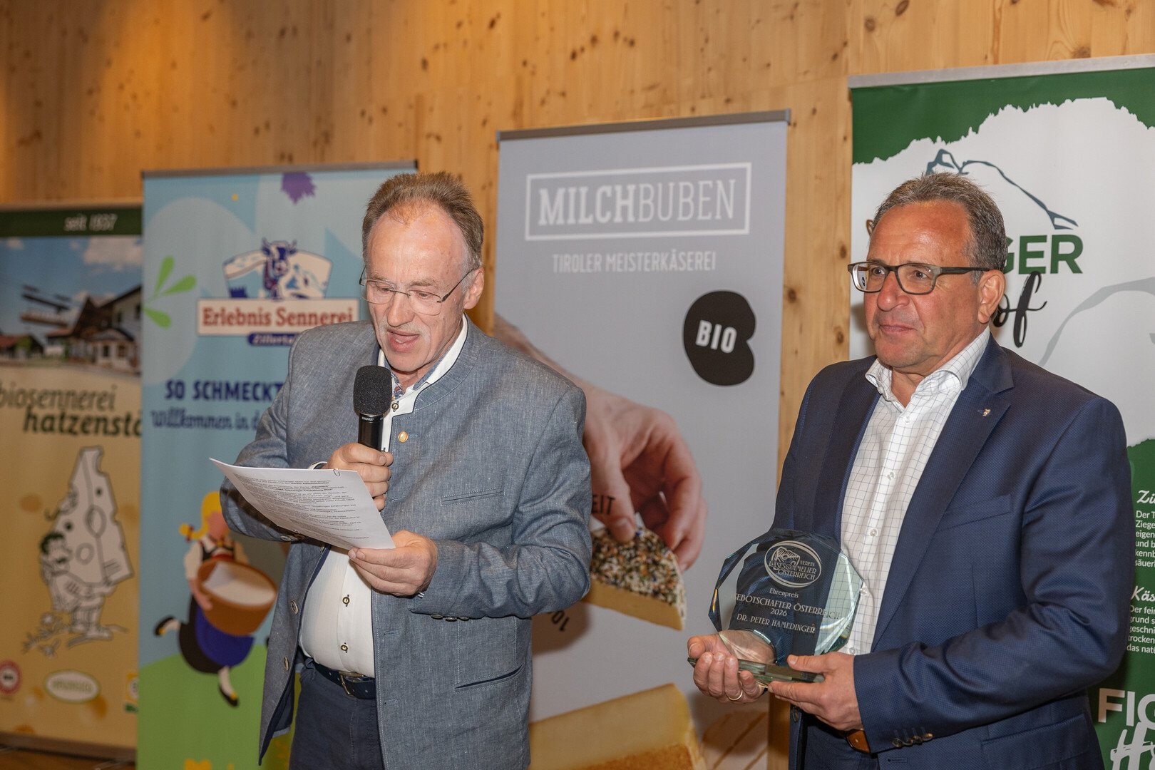 Ein besonderer Höhepunkt des Abends war die Ehrung unseres geschätzten Mitgliedes DI Dr. Peter Hamedinger, Marketingleiter für tierische Produkte bei der AMA (Agrarmarkt Austria), für seine herausragenden Verdienste in der österreichischen Milch- und Käsebranche. Die Laudatio hielt Josef Stiendl, der in warmherzigen Worten die Leistungen und das langjährige Engagement des Geehrten würdigte.